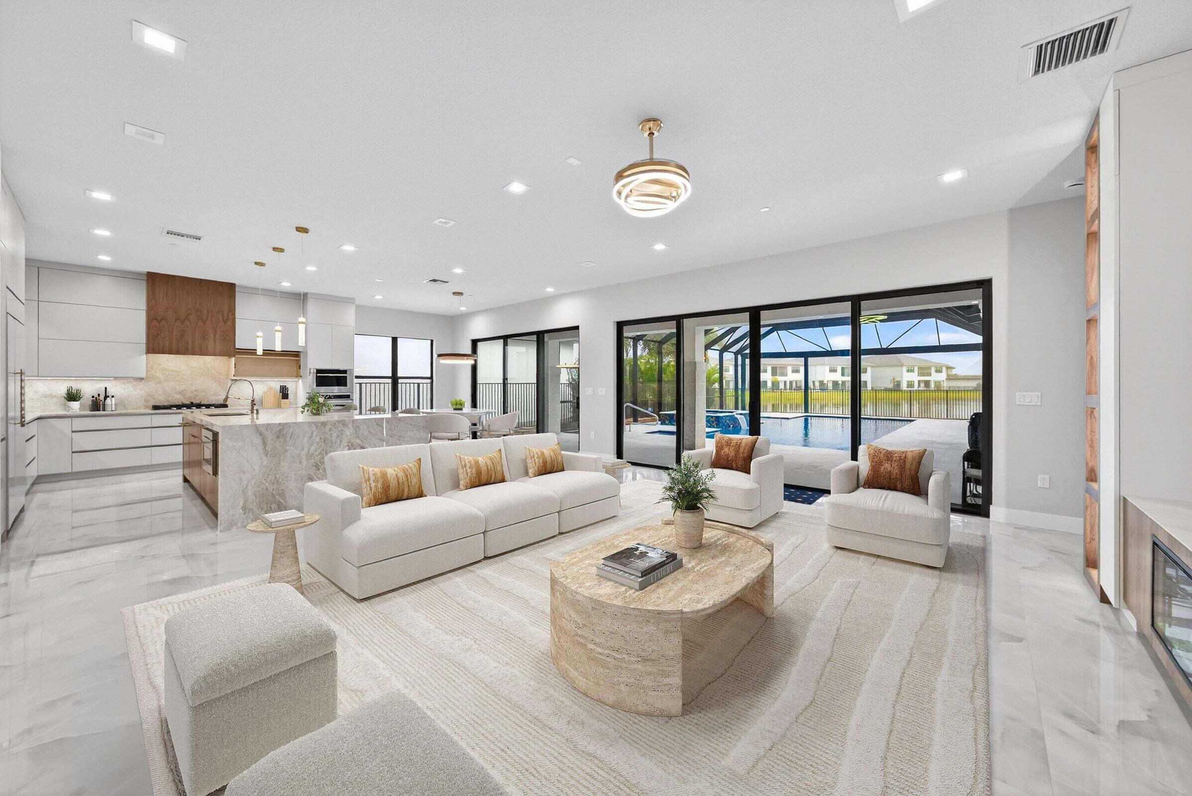 DescriptionBRAND NEW Luxury residence in Apex at Avenir. This striking modern two story 5 bedroom, 5.5 bath home offers over 5,136 square feet of impeccably designed living space, perfectly positioned on a premium lakefront homesite with beautiful water views. Exceptional upgrades and top of the line finishes are showcased throughout, creating a truly elevated living experience. Upon arrival, an expansive foyer sets the tone with custom LED light fixtures, a sleek designer staircase with custom railing, and elegant panel molding extending to the second floor. Be impressed by flawless Level 5 finished walls complemented by custom paint throughout The chef's kitchen is a showpiece, offering custom floor to ceiling Kabco wood cabinetry with Designers trendy Walnut combo modern Gola design pairing effortlessly with a dramatic Quartzite Taj Mahal waterfall island, offering ample storage and inviting snack bar seating. A seamless quartzite backsplash with concealed outlets, maintains clean architectural lines, while gold hardware adds a touch of warmth. Professional grade Sub Zero and Wolf appliances including, steam and convection ovens, a 5 burner gas cooktop, and a statement hood. Two pantry options include a dedicated kitchen pantry and a spacious walk in pantry tucked beneath the staircase. The kitchen opens effortlessly to the dining area and family room, ideal for entertaining. The family room features a custom built in with display cabinetry, remote access Linear LED electric heated fireplace and a dry bar with beverage refrigerator, blending style and function. The primary suite conveniently located on the first floor impresses with custom lighting, dual walk in custom closets, and a spa inspired bath with dual vanities, soaking tub, separate private water closets with ADA accessible sink and ADA accessible glass walk in shower showcasing three shower heads and built in seating. The home features European engineered white oak flooring and 2 x 4 porcelain tile throughout. A custom, private ADA accessible elevator leads to the 4 upstairs bedrooms, media room and loft. A wall of glass spans the rear of the home, unveiling the grand outdoor living space. Enjoy a screened in patio and an oversized gas heated salt water pool and spa with sun shelf framed by marble stone pavers. Built in planters include water bibs and power sources for convenience, and the home is pre plumbed for a future summer kitchen. Additional highlights include two laundry rooms (one on each floor) with large capacity Electrolux appliances, a second floor wet bar in the loft space, impact glass throughout, and a 3 car garage with epoxy flooring, workspace, and storage. Get excited for the exclusive Apex at Avenir brand new clubhouse featuring lush landscaping, picturesque walking trails, pickleball and tennis courts, state of the art fitness center, elegant lobby and lounge with bar and expansive sun deck with shaded cabanas surrounding the lap pool and whirlpool spa. Additionally, a new Town Center, now under development offering shopping and dining options. Enjoy peace of mind with a 24 hr manned gate at Apex. This exceptional home is a rare offering where modern design, premium finishes, and thoughtful craftsmanship come together to create a truly elevated lifestyle in Avenir.
